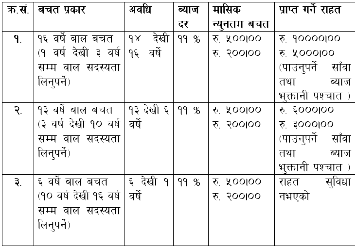 – बाल बचतको अवधि, प्रकार, ब्याजदर र उच्च शिक्षा राहत निम्नअनुसार रहेको छ ।